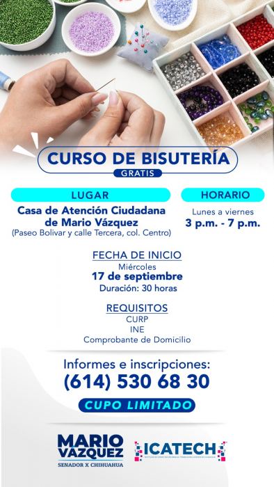 Chihuahua, Chih.- Con la finalidad de impulsar el desarrollo económico de las familias chihuahuenses, la Casa de Atención Ciudadana del Senador Mario Vázquez invita al curso gratuito de bisutería, una capacitación práctica que permitirá a los participantes adquirir habilidades útiles para iniciar su propio negocio o generar ingresos adicionales.El curso es impartido por personal del ICATECH y tendrá una duración de 30 horas. Se impartirá en horario de 3:00 a 7:00 de la tarde, del miércoles 17 al viernes 26 de septiembre, en las instalaciones de la Casa de Atención Ciudadana ubicada en la Bolívar y C. Tercera de la colonia Centro.
