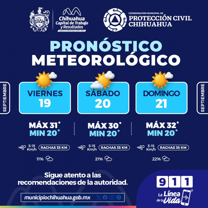 Por FELAProtección Civil Municipal emitió el pronóstico del clima del 19 al 21 de septiembre: viernes mayormente soleado con 31°C, sábado con 21% de probabilidad de lluvia y domingo con 22%. Se recomienda precaución al conducir y mantener limpias coladeras para evitar encharcamientos.