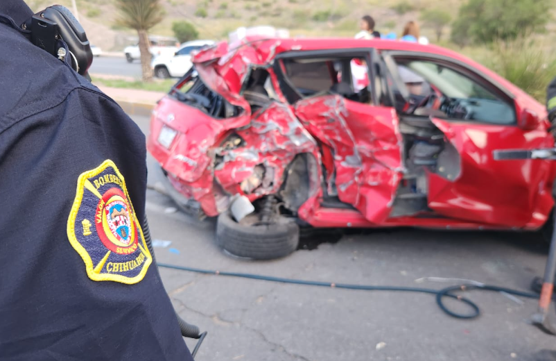 Chihuahua, Chih.- Un accidente vial se registró esta tarde en el periférico Francisco R. Almada, cerca del Cerro Grande, donde una camioneta GMC Sierra colisionó por alcance contra un automóvil Toyota Matrix. El impacto provocó que ambas unidades se desplazaran hacia los carriles contrarios, quedando la pickup dentro de un arroyo con riesgo de volcar.