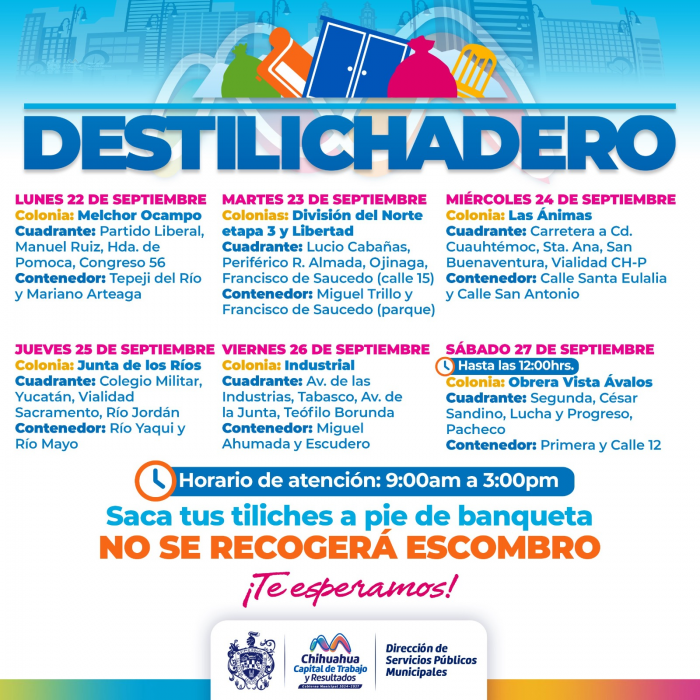 Por FELAChihuahua, Chih.— El Gobierno Municipal anunció el calendario del programa Destilichadero, que se llevará a cabo del 22 al 27 de septiembre en siete colonias de la capital, con el objetivo de evitar acumulaciones de basura de gran tamaño que puedan generar plagas o riesgos a la salud.