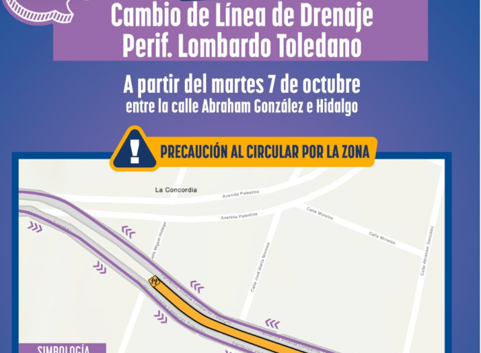 La Junta Municipal de Agua y Saneamiento (JMAS) de Chihuahua informó que este martes 7 de octubre se llevarán a cabo trabajos de reparación en un tramo de drenaje ubicado sobre el periférico Lombardo Toledano, a la altura de la calle Abraham González.