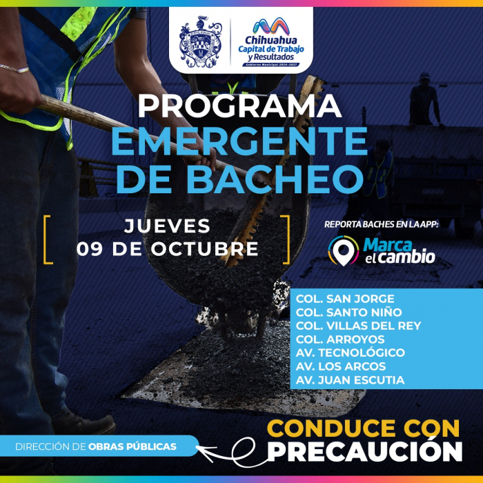 Por RedaccionChihuahua, Chih.- El Gobierno Municipal de Chihuahua continúa con el programa emergente de bacheo, que este jueves 9 de octubre realizará trabajos en colonias como San Jorge, Santo Niño, Arroyos y Villas del Rey, además de las avenidas Tecnológico, Los Arcos y Juan Escutia.