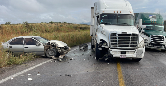 Chihuahua, Chih.- Un choque frontal entre un tráiler y un vehículo particular dejó tres personas lesionadas esta mañana en el kilómetro 9 de la carretera libre Chihuahua–Ciudad Juárez, en el tramo conocido como las Curvas del Perico.De acuerdo con los primeros reportes, un Nissan Sentra que circulaba en sentido contrario invadió el carril del tráiler de la empresa Ochoa S.A. de C.V., número económico 013, lo que provocó el fuerte impacto.