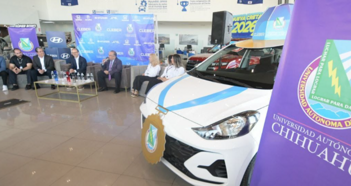 Chihuahua, Chih.- El Grupo Cleber anunció que regalará un automóvil Hyundai i10 modelo 2025 entre los atletas de la Universidad Autónoma de Chihuahua que conquistaron la medalla de oro en la pasada Universiada Nacional de Puebla.El anuncio se realizó en las instalaciones de Hyundai Chihuahua con la presencia del rector de la UACh, Luis Rivera Campos; el director de marcas de Grupo Cleber, Federico Jaime; el director de Deportes Universitarios, Óscar Erives Hernández, y directivos de distintas marcas del grupo automotriz.