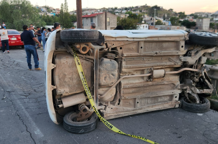 Chihuahua, Chih.- Un aparatoso accidente ocurrió sobre la avenida Pacheco, casi cruce con Pedro Meoqui, luego de que el conductor de un vehículo Chevrolet Spark, presuntamente menor de edad, perdiera el control y ocasionara una serie de choques que provocaron gran congestionamiento en ambos sentidos de la vialidad.El joven circulaba a alta velocidad con dirección sur-norte cuando salió de la cinta asfáltica, impactó contra la base de un poste de alumbrado en el camellón central, volcó hacia el carril contrario y golpeó un Honda Civic y una motocicleta que se encontraba detenida por una avería.