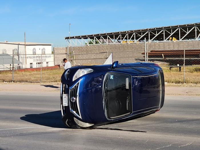 Chihuahua, Chih.- Un accidente entre un tráiler y un automóvil Nissan Versa provocó la volcadura del vehículo compacto sobre el periférico Francisco R. Almada, a la altura de la calle Niños Héroes, en la colonia Villa Juárez.Las primeras versiones señalan que ambos vehículos avanzaban en el mismo sentido cuando el Versa golpeó una de las llantas delanteras del tráiler. El impacto ocasionó que el conductor perdiera el control, saliera del camino, cruzara el camellón central y quedara volcado sobre los carriles opuestos.
