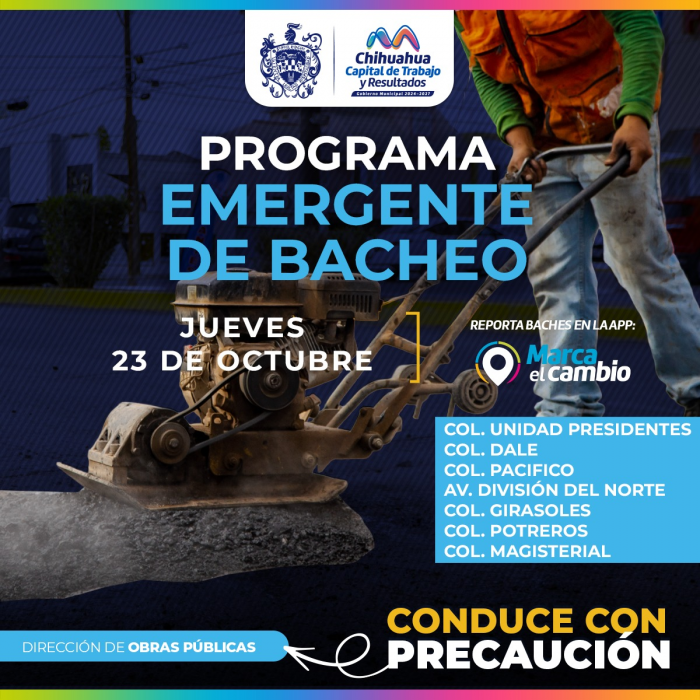 Por RedacciónChihuahua, Chih. – La Dirección de Obras Públicas del Gobierno Municipal realizará labores de bacheo este jueves en las colonias Unidad Presidentes, Dale, Pacífico, Girasoles, Potreros, Magisterial y en la avenida División del Norte. Las cuadrillas iniciarán trabajos a las 8:00 a.m., por lo que se recomienda a los conductores extremar precauciones.