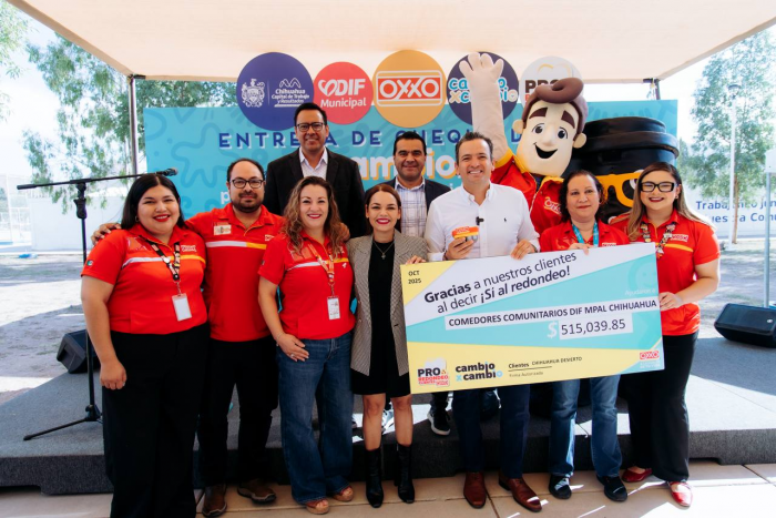 Por RedacciónChihuahua, Chih.- El alcalde Marco Bonilla y la presidenta del DIF Municipal, Karina Olivas, recibieron un cheque por 515 mil pesos de la cadena OXXO, resultado del programa “Cambio x Cambio” realizado en más de 300 tiendas de la región. Los recursos serán destinados a mejorar los comedores comunitarios del DIF Municipal.