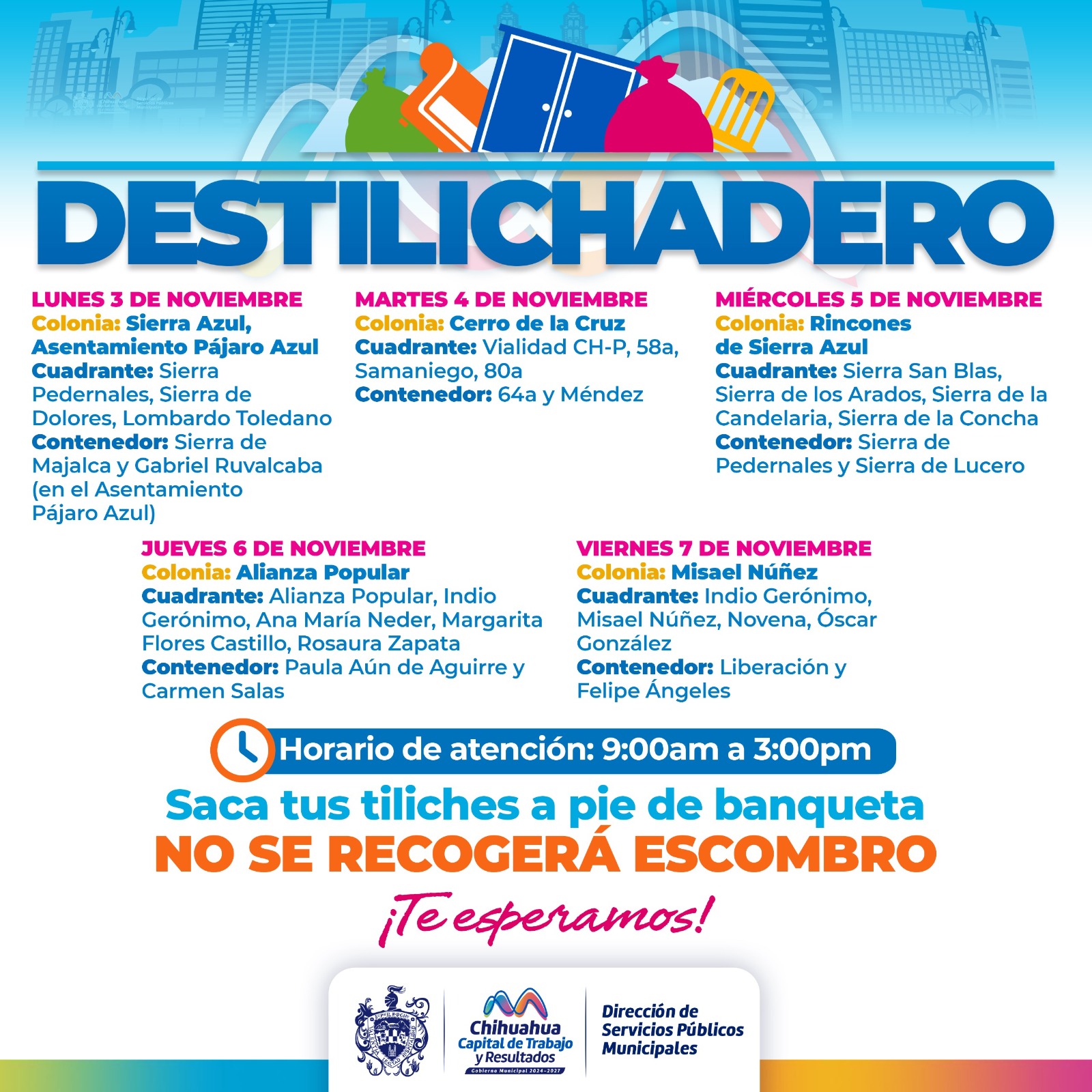 Por FELAH. Ciudad de Chihuahua, Chih., a 1 de noviembre de 2025.- La Dirección de Servicios Públicos Municipales, informa el calendario del programa Destilichadero, que se realizará en seis de colonias de la Capital del 3 al 7 de noviembre con el objetivo de evitar acumulaciones de basura de grandes dimensiones en las viviendas, que podría generar plagas o problemas de salud, .