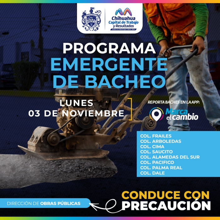 Por RedacciónChihuahua, Chih.— Cuadrillas municipales estarán reparando baches este lunes 3 de noviembre en colonias como Cima, Los Frailes, Saucito, Arboledas, Alamedas del Sur, Pacífico, Palma Real y Dale.