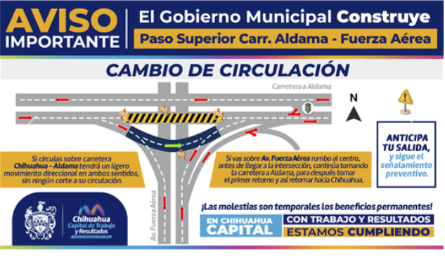El Gobierno Municipal, a través de la Dirección de Obras Públicas, reitera a la ciudadanía los cambios de circulación por la construcción del Paso Superior Carretera Aldama y avenida Fuerza Aérea, obra que mejorará la circulación vehicular de más de 350 mil habitantes que transitan frecuentemente por el sector.Debido a los diferentes trabajos que se estarán realizando en este cruce, aquellos que avanzan en el sentido Chihuahua-Aldama tendrán un ligero movimiento direccional en ambos sentidos, sin ningún corte a la circulación.