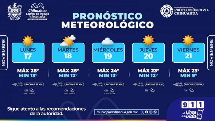 Por FELAChihuahua, Chih., a 17 de noviembre de 2025.- El Gobierno Municipal de Chihuahua, a través de la Coordinación Municipal de Protección Civil, informa que durante esta semana se prevén mañanas frescas, así como tardes un poco más calurosas, por lo que exhortan a no bajar la guardia y cuidarse de los cambios de temperatura para evitar enfermedades.