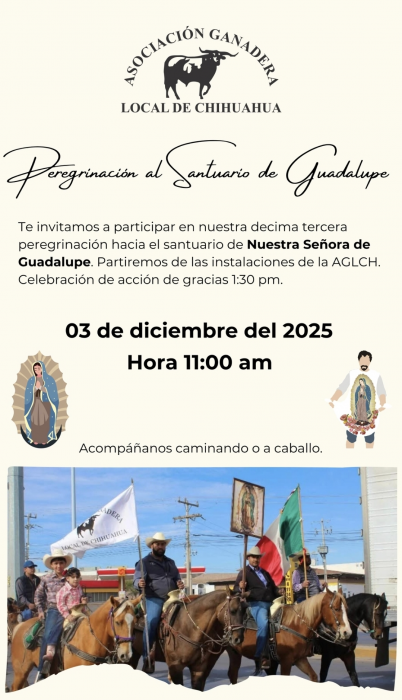 Chihuahua, Chih.- La Asociación Ganadera Local de Chihuahua anunció la realización de su peregrinación anual hacia el Santuario de Nuestra Señora de Guadalupe, evento que se desarrollará el próximo 3 de diciembre a las 11:00 horas. Esta será la edición número trece de la convocatoria.El contingente saldrá desde las instalaciones de la asociación, siguiendo el trayecto tradicional hasta el templo guadalupano. Autoridades del organismo destacaron que esta actividad representa un momento significativo de unión para las familias y el sector ganadero de la región.