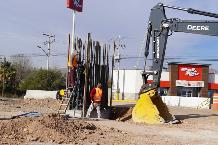 Chihuahua, Chih.- La Dirección de Obras Públicas, avanza a buen ritmo en la construcción del Paso Superior de la carretera Chihuahua–Aldama y la avenida Fuerza Aérea, obra que registra un avance global del 20%.Como parte de la ejecución de esta importante solución vial para las y los habitantes de Chihuahua Capital, las cuadrillas trabajan en distintos frentes, entre los que destacan el cimbrado y colado de columnas y glorieta, así como la colocación de piezas de concreto para muros de tierra armada en las rampas de acceso.