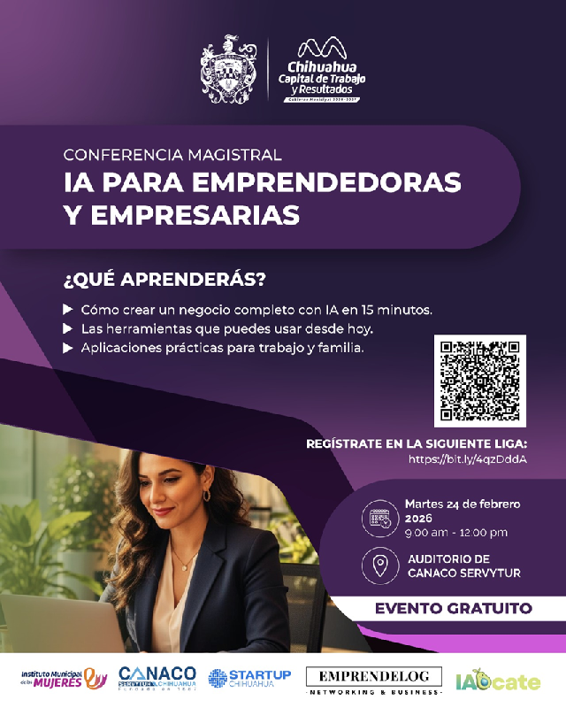 La Conferencia Magistral “IA para Emprendedoras y Empresarias”, se llevará a cabo el martes 24 de febrero de 2026, de 9:00 a 12:00 horas; el Taller Intensivo “IA para la Vida Familiar”, este jueves 26 y viernes 27 de febrero, de 9:00 a 13:00 horas; y el Taller Intensivo “IA Práctica para Emprendedoras”, que se desarrollará el viernes 6 de marzo de 2026, de 16:00 a 20:00 horas, y el sábado 7 de marzo de 2026, de 9:00 a 13:00 horas.