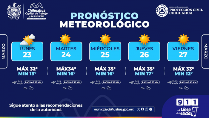 El Gobierno Municipal de Chihuahua, a través de la Coordinación Municipal de Protección Civil, informa que para esta semana se esperan altas temperaturas, con máximas de hasta 35°C, por lo que exhortan a cuidarse de las altas temperaturas para evitar afecciones a la salud.De acuerdo al Servicio Meteorológico Nacional, para este lunes, se pronostica una temperatura máxima de 32°C y mínima de 13°C, con cielo parcialmente nublado.