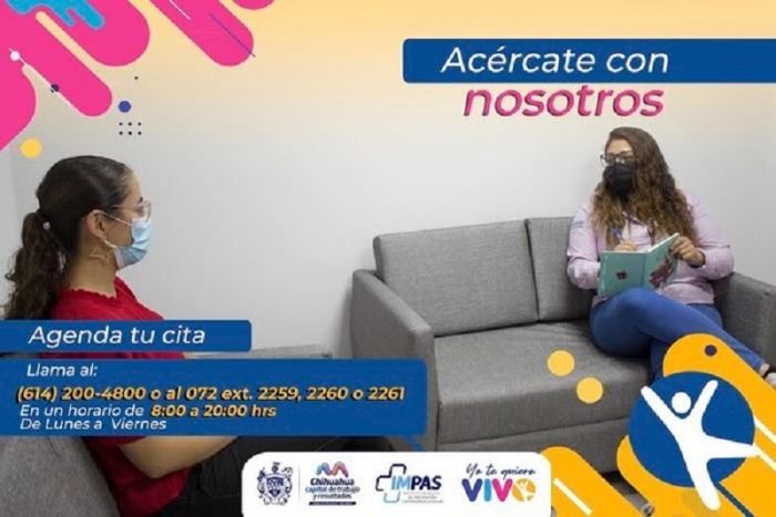Chihuahua, Chih.- Para el alcalde Marco Bonilla, la salud mental es un tema fundamental para el desarrollo integral de las familias chihuahuenses, por ello el Gobierno Municipal de Chihuahua, a través del Instituto Municipal de Prevención y Atención a la Salud (IMPAS), invita a la ciudadanía a hacer uso del servicio de consulta psicológica, que se brinda en las instalaciones de la dependencia en calle Sexta, en esquina con calle Francisco Xavier Mina, en la colonia Centro.