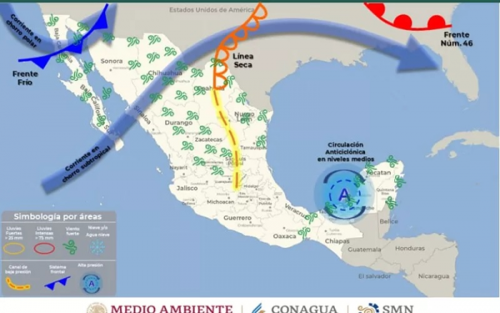El posible ingreso del frente frío número 47 se aproximará sobre el noroeste del país durante la madrugada del martes, en interacción con el ingreso de humedad generada por la corriente en chorro, una línea seca sobre Coahuila y un canal de baja presión.