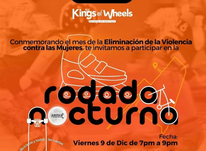Chihuahua, Chih.- Como parte de las actividades de los 16 días de activismo en el marco del Día Internacional de la Eliminación de la Violencia contra la Mujer, el Gobierno Municipal a través del Instituto Municipal de las Mujeres (IMM), te invita a la rodada nocturna, este viernes 9 de diciembre de 7:00 pm a 9:00 pm, en la Plaza de Armas.