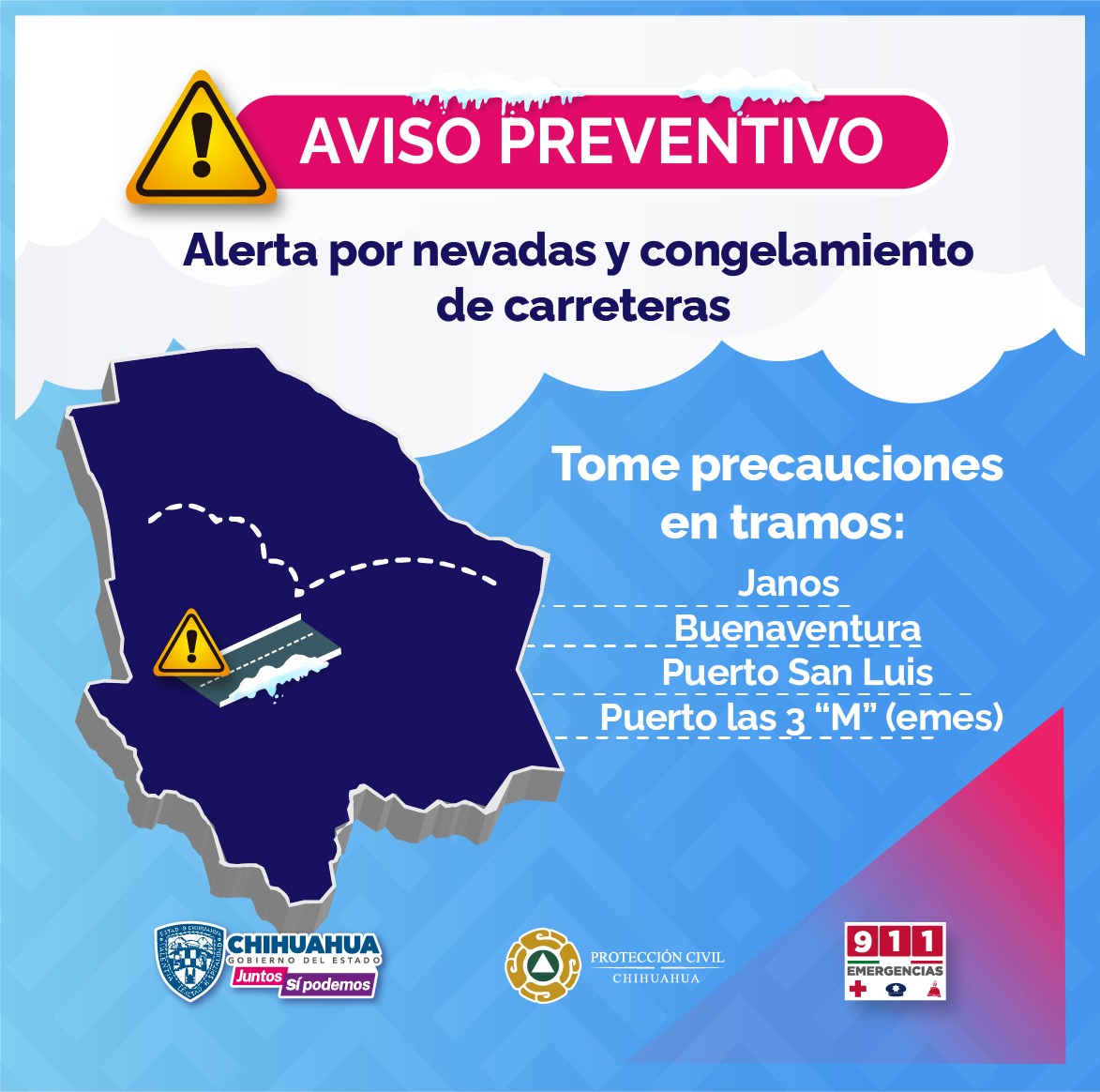 La CEPC exhortó a los automovilistas que transitan por tramos carreteros de Janos y Buenaventura, como Puerto San Luis y Puerto las 3 “M” (emes), que extremen precauciones por la posibilidad de presencia de nieve.