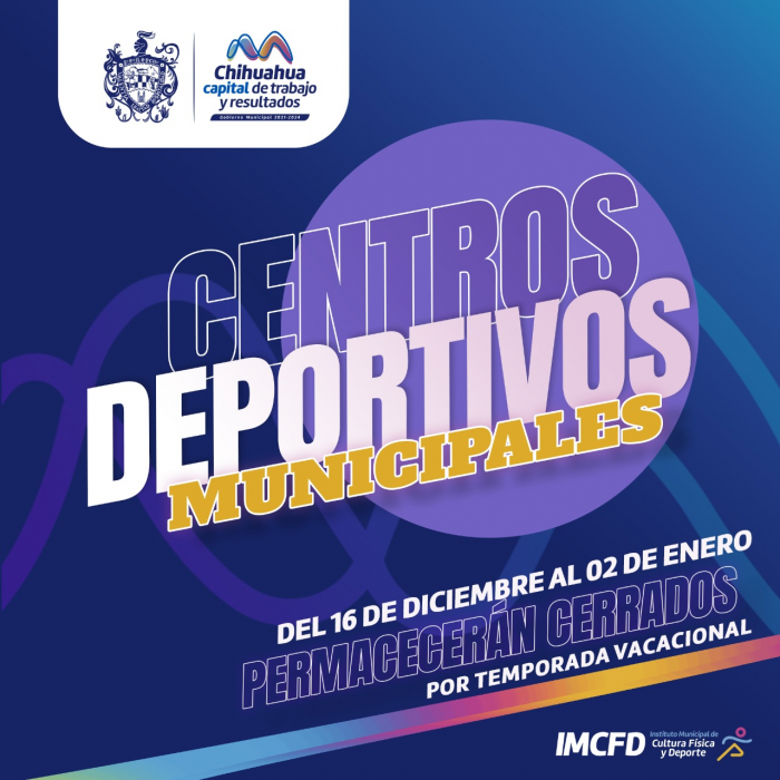 Chihuahua.- Elierno Municipal, a través del Instituto Municipal de Cultura Física y Deporte, informa que los cuatro centros deportivos, permanecerán cerrado al público del 16 de diciembre al 2 de enero 2023, por temporada vacacional.
