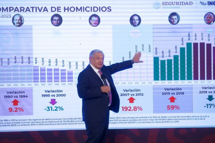 El jefe del Ejecutivo pidió proyectar en la pantalla del Salón Tesorería de Palacio Nacional los resultados en homicidios dolosos de su gobierno y lo comparó con los índices que hubo en los gobiernos de Carlos Salinas de Gortari hasta el suyo, en donde afirmó que hay una baja del 13.4%.