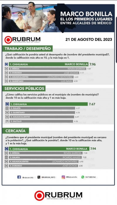 Chihuahua, Chih.- De acuerdo a la encuesta realizada por RUBRUM, en la edición del mes de agosto, el alcalde de Chihuahua Capital, Marco Bonilla Mendoza, encabezó el primer lugar de los mejores evaluados cercanía, servicios públicos, trabajo y desempeño.Cabe mencionar que, en esta encuesta la población evalúa el desempeño de los alcaldes de las 31 capitales de todo el país.