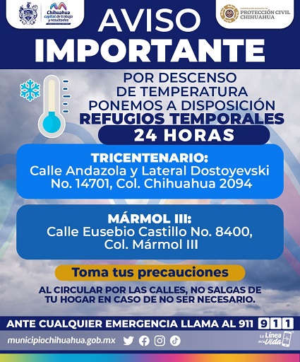 Se invita a la ciudadanía a canalizar a personas en situación de calle, para que reciban una atención adecuada en los refugios temporales. Así como también, mantenernos atentos a los posibles cambios climatológicos por medio de los canales oficiales y redes sociales de las autoridades municipales y estatales de Chihuahua.