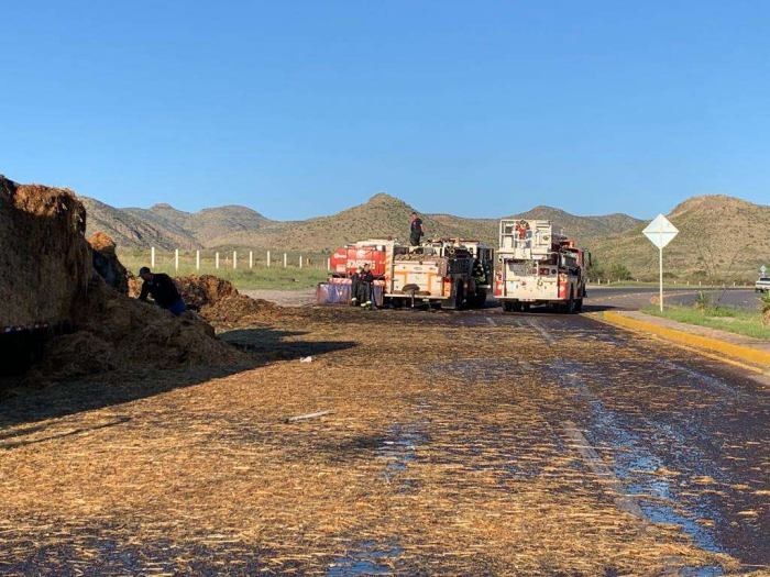 Chihuahua, Chih.- Desde la madrugada se registró un incendio en las Cuevas del Perico, el cual consumió una plataforma de un trailer cargado con alfalfa, esto generó cuantiosos daños materiales y perdidas para la empresa.