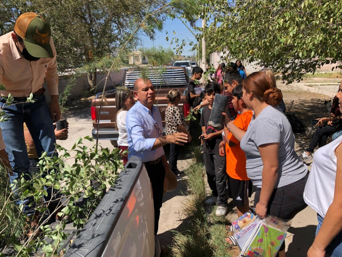 Ciudad Juárez Chih.-Vecinos y residentes de colonias ubicadas al sur y sur oriente de Ciudad Juárez, continúan mostrando genuino interés por arborizar sus propiedades y áreas comunes, a través de las gestiones realizadas de forma continua, por el diputado del distrito 08 Cuauhtémoc Estrada Sotelo.Mediante la entrega directa de arbolitos listos ya para ser sembrados, el legislador junto con su equipo de entusiastas por mejorar el entorno urbano del sector con mayor crecimiento de la frontera, entregaron hasta 50 árboles que iban desde pino afgano, encino, trueno y fresno los cuales cumplen con los requisitos que exigen expertos, en que no sean grandes consumidores de agua, de no romper banquetas y cuando alcanzan altura suficiente otorgan gran sombra y aire fresco.