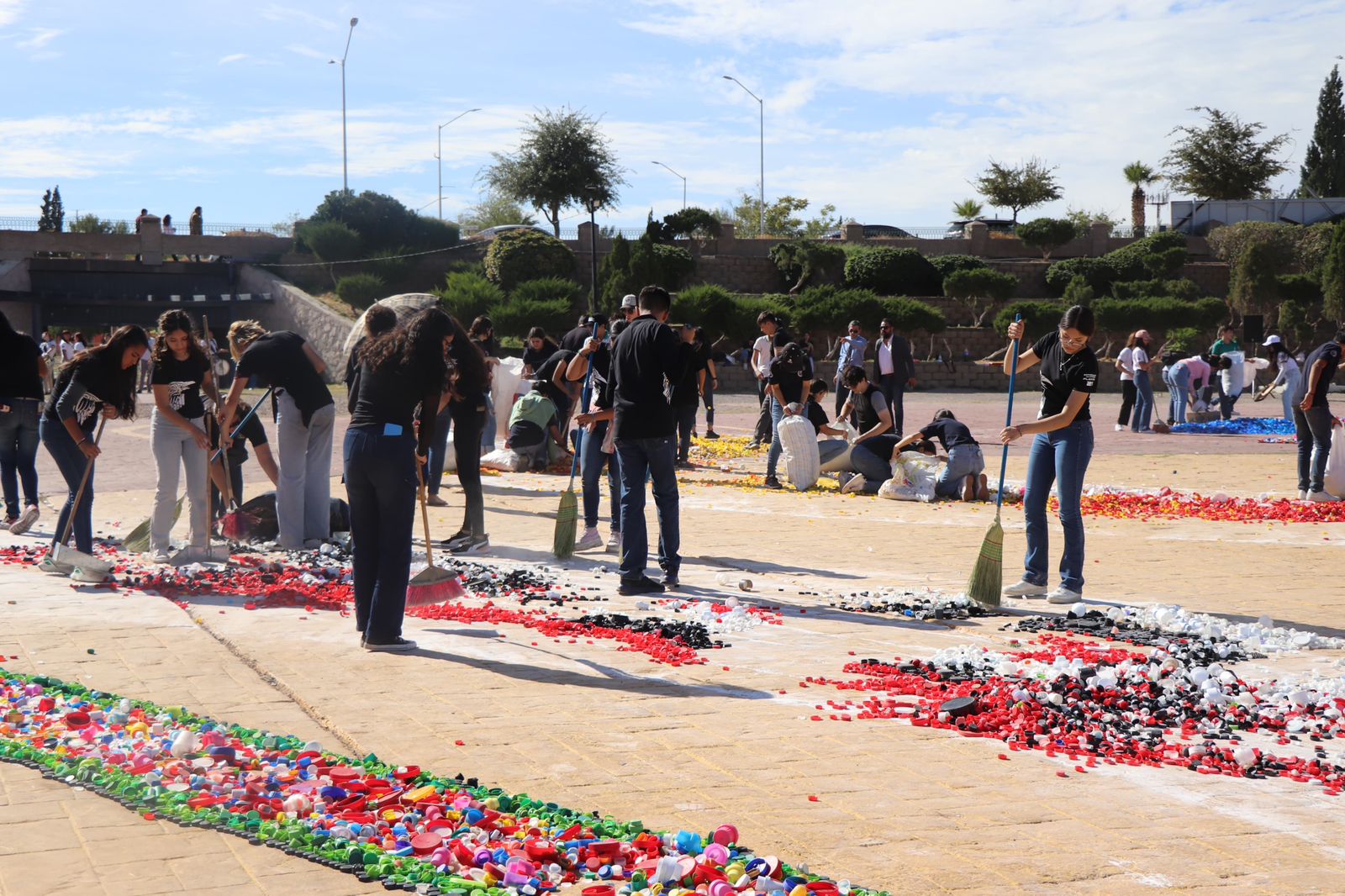 Los costales con tapaderas llegaron a “El Palomar” provenientes de los 31 planteles del estado, donde 500 alumnos que representaron a los 43 mil estudiantes del COBACH, se dieron a la tarea de separar las tapas por color y luego rellenar los trazos que en una superficie de 380 metros cuadrados, formaron el logotipo del 50 Aniversario del Colegio de Bachilleres en un lapso de 4 horas con 18 minutos.