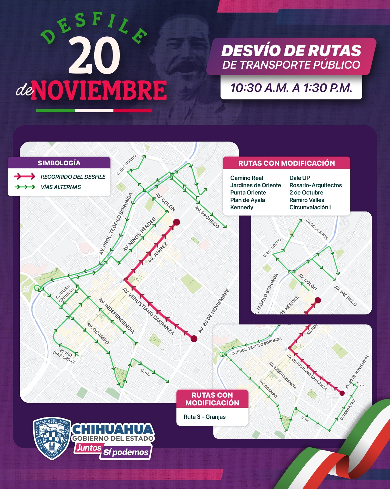 Por FELAChihuahua, Chih.- La Secretaría General de Gobierno, a través de la Subsecretaría de Transporte, da a conocer las modificaciones temporales en 11 rutas que transitan de las zonas sur y poniente hacia al centro, debido al tradicional desfile en conmemoración del 113 Aniversario del Inicio de la Revolución Mexicana.