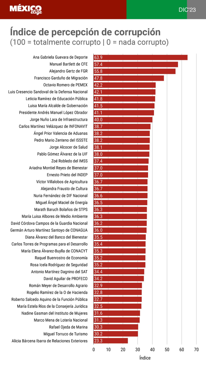 Al ser cuestionados sobre los personajes políticos más corruptos, la lista la encabezó Ana Gabriela Guevara con un 63.9 en el índice de percepción de corrupción, el político que le siguió en este índice fue Manuel Barlett de la CFE con 57.4 y el tercero lo ocupó Alejandro Gertz de la FGR con un 55.8.