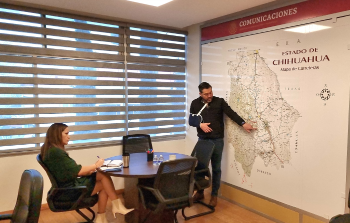 Por FELAChihuahua, Chih.- El diputado local por el distrito 21, Edgar Piñón Domínguez, y la nueva directora de la Secretaría de Comunicaciones y Transportes, Imelda Guerra Villalobos retomaron en conjunto la agenda de trabajo para la aplicación de más de 70 millones de pesos asignados para la mejora y rehabilitación de la Vía Corta a Parral, lo anterior en reunión celebrada en las instalaciones de la dependencia federal.