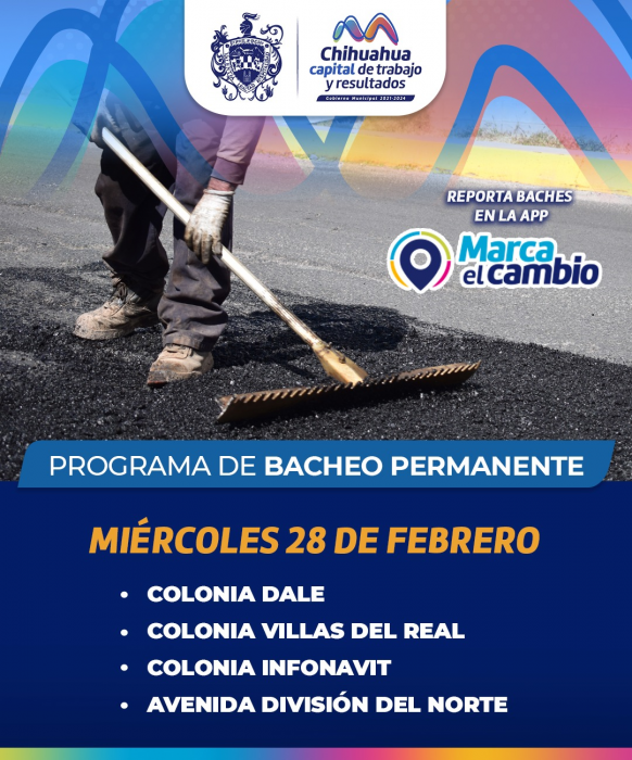 Chihuahua, Chih.- El Gobierno Municipal continúa trabajando con bacheo e informa que hoy 28 de febrero de atenderán reportes ciudadanos en las colonias Dale, Villas del Real, Infonavit y avenida División del Norte.