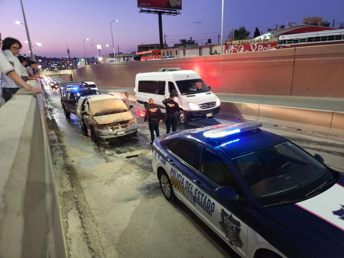 Chihuahua, Chih.- Un vehículo se incendió esta tarde mientras circulaba por el Periférico de la Juventud, a la altura del cruce con la calle Geranios, lo que generó una movilización de cuerpos de emergencia.