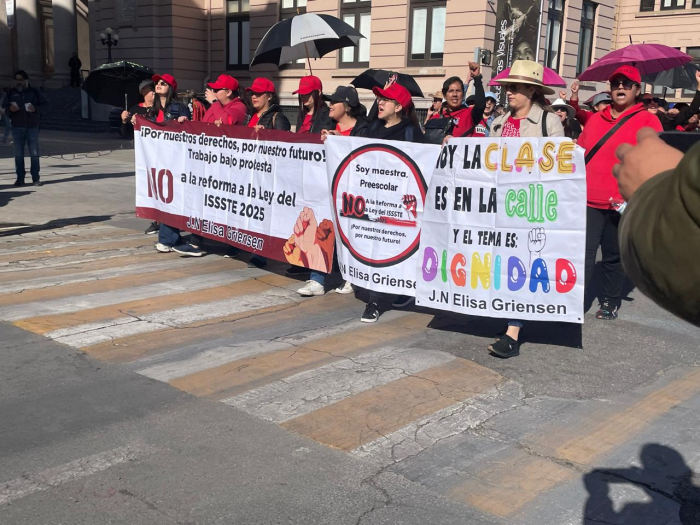 A lo largo de la protesta, los participantes corearon consignas y portaron pancartas rechazando las modificaciones propuestas a la ley, al considerar que afectan sus prestaciones y condiciones de jubilación.