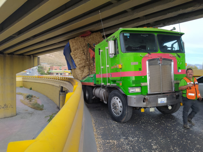 Chihuahua, Chih.- Durante la tarde de este jueves un camión quedó atorado por la gran cantidad de paja que trasladaba por la avenida Teófilo Borunda hacia la carretera a...