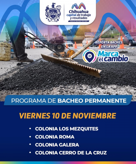 Chihuahua, Chih.- El Gobierno Municipal, encabezado por el alcalde Marco Bonilla, realiza trabajos de bacheo en diferentes puntos de la ciudad, a fin de dar...