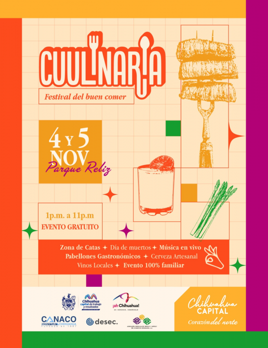 Chihuahua, Chih.- El Gobierno Municipal encabezado por el alcalde Marco Bonilla, recuerda a la ciudadanía que este 4 y 5 de noviembre podrán disfrutar de la quinta edición del festival CUULINARIA, evento gratuito y para toda la...