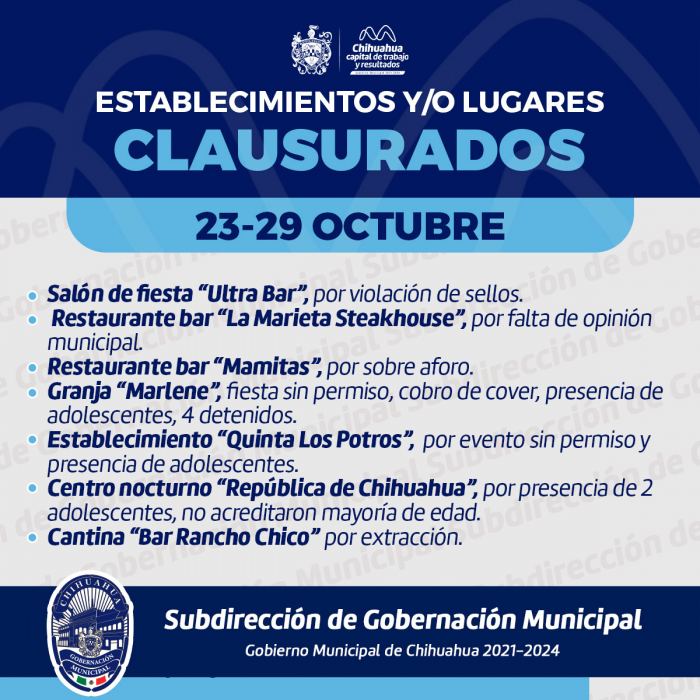 Chihuahua, Chih.- En la semana del 23 al 29 de octubre a través de la Subdirección de Gobernación de la Secretaría del Ayuntamiento, realizaron 208 inspecciones a locales y...