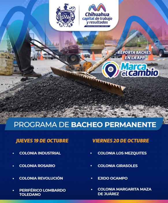 Chihuahua, Chih.- El alcalde Marco Bonilla mantiene el compromiso de una circulación segura y eficaz en la Capital, es por eso que continúan los trabajos de bacheo con el Programa Permanente que realiza la Dirección de Obras...