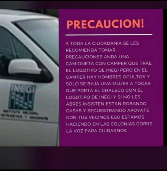Chihuahua, Chih.- Distintos grupos de WhatsApp estuvieron publicando un aviso de precaución de personas quienes supuestamente fíjense personal del inegi para después robar casas y secuestrar personas.
