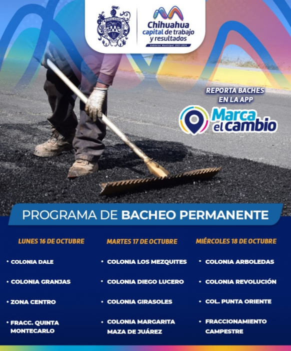 Chihuahua, Chih.- El Gobierno Municipal, que preside el alcalde Marco Bonilla, continúa trabajando con el Programa Permanente de Bacheo...