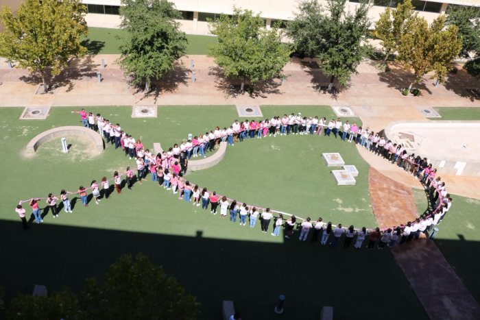 Chihuahua, Chih.- En el marco del Día Internacional de Lucha contra el Cáncer de Mama, la Sociedad de Alumnos de la Facultad de Enfermería y Nutriología formó un moño rosa en el patio de la unidad...