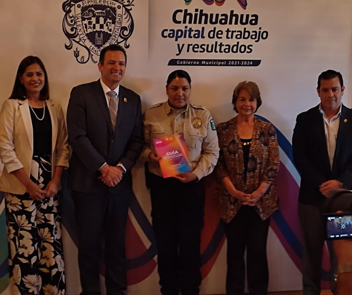 Chihuahua, Chih.- En evento encabezado por el alcalde, Marco Bonilla fue entregada de manera simbólica una guía para la Intervención Policial en el Delito de Violencia Familiar a elementos de la Dirección de Seguridad...