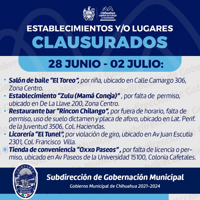 Chihuahua, Chih.- El Gobierno Municipal de Chihuahua, del 28 de junio al 02 de julio, a través de la Subdirección de Gobernación de la Secretaría del Ayuntamiento, realizó 133...