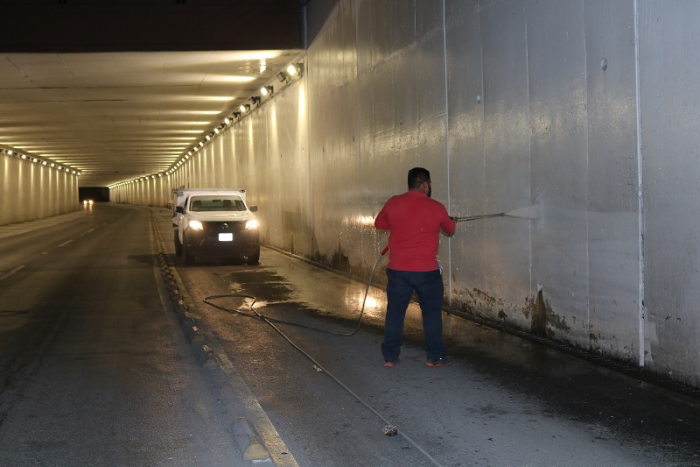 Chihuahua, Chih.- Con el objetivo de mantener una buena imagen urbana, el Gobierno Municipal, a través de la Dirección de Servicios Públicos, trabaja en el lavado de paredes del túnel ubicado...