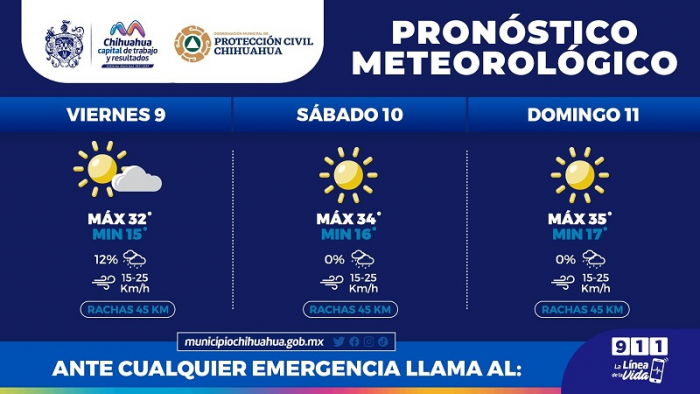Chihuahua, Chih.- La Coordinación Municipal de Protección Civil, informa que este fin de semana, del 9 al 11 de junio, se prevén temperaturas máximas de 35°C y mínimas de 15°C, de...