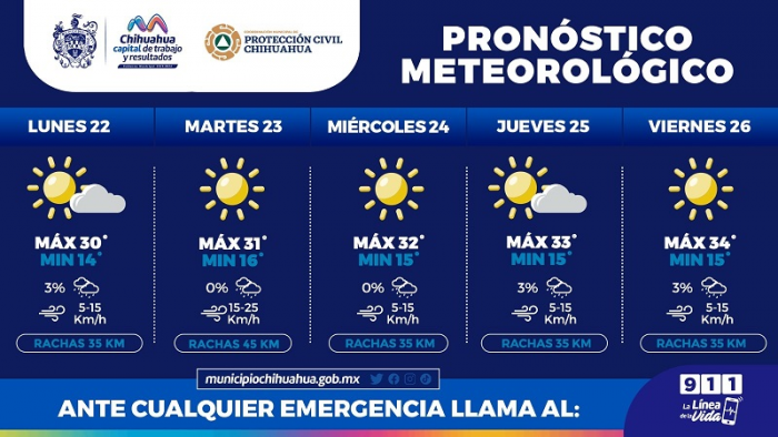 Chihuahua, Chih.- La Coordinación Municipal de Protección Civil, informa a la población que, para la semana del 22 al 26 de mayo, se pronostican temperaturas calurosas con máximas de 34°C,...